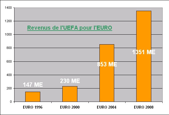 Bien qu'organisé tous les quatre ans, le championnat d'Europe des Nations représente une véritable pépite pour l'UEFA. Le résultat net de la compétition est de 253 M€ en 2008 contre 223 M€ en 2004. Autre illustration de l'importance de cette compétition dans les résultats financiers de l'organisation, le résultat de l'exercice comptable 2007/08, qui tient compte de l'Euro 2008, est de 236 M€ contre 39 M€ et 32 M€ lors des exercices 2006/07 et 2005/06 sans championnat d'Europe des nations. le schéma ci-dessous illustre la fulgurante progression des revenus de l'UEFA dont la cause principale est la croissance des recettes de la commercialisation des droits TV qui se sont négociés à hauteur de 801 M€ en 2008 contre 53 M€ en 1996.